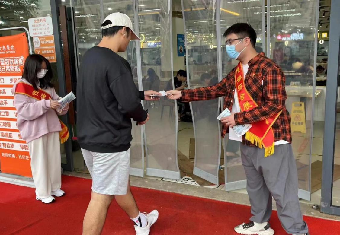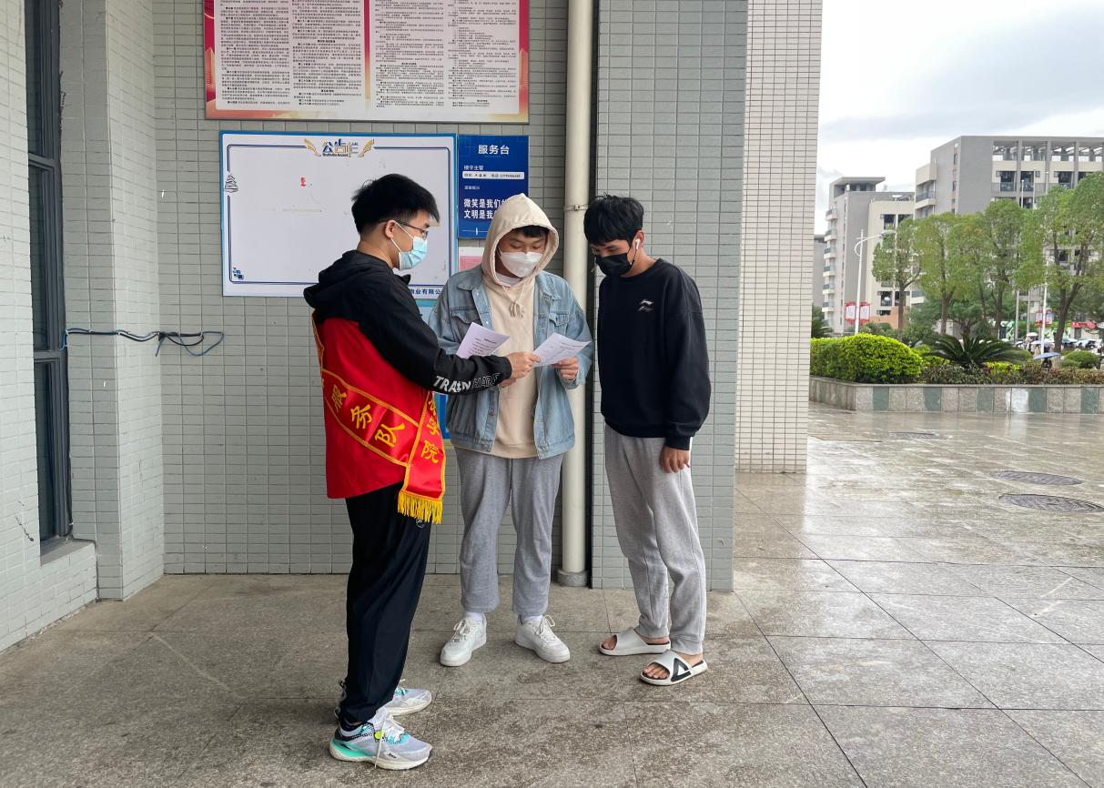志愿者们分布于各个宿舍楼区,在门口发放精心准备的防疫倡议书,耐心为同学们详细解说疫情防控小知识,以朋辈独有的感染力做好防疫宣传。另外,在各栋学生宿舍楼一楼大厅设置口罩发放点,为口罩物资不足的同学提供口罩,并引导同学们出门佩戴好口罩。