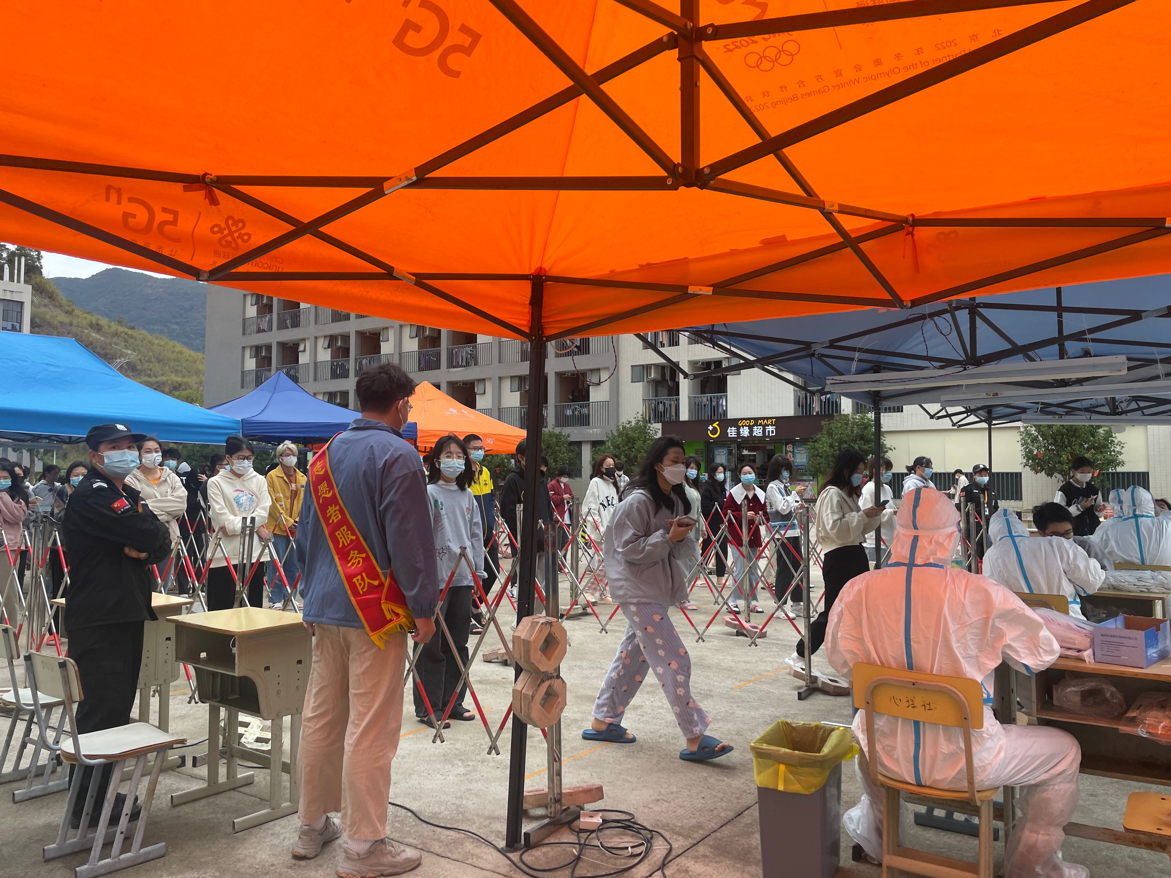 “请大家正确佩戴好口罩,保持一米距离......”,在核酸采样现场,志愿者们披上绶带,维持着现场秩序,一遍遍提醒同学防疫注意事项,为保障核酸采样工作有序进行贡献自己的一份力量。同时,为阻隔核酸区与快递区,志愿者们在菜鸟驿站门口引导同学们有序领取快递,立取立走,减少人员聚集和拥堵。
