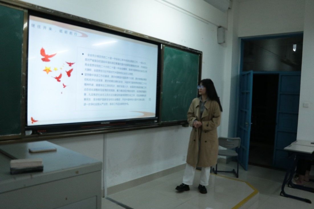 宣讲过程中,何梦珊同学简要介绍了十四届全国人大一次会议和全国政协十四届一次会议的内容,并详细阐述了此次会议对进一步动员全党全国各族人民为全面建设社会主义现代化国家、全面推进中华民族伟大复兴的重大意义。随后,王孔泷同学强调,学习党的二十大精神是当代青年学生需要掌握的核心素养,我们不仅要在学习上勤奋努力,还要在新时代新征程的奋斗全过程中,以始终不变的韧劲、坚定不移的执着,高举中国特色社会主义伟大旗帜,推动党和国家事业不断向纵深发展,为谱写新时代中国特色社会主义更加绚丽的华章点睛增色。