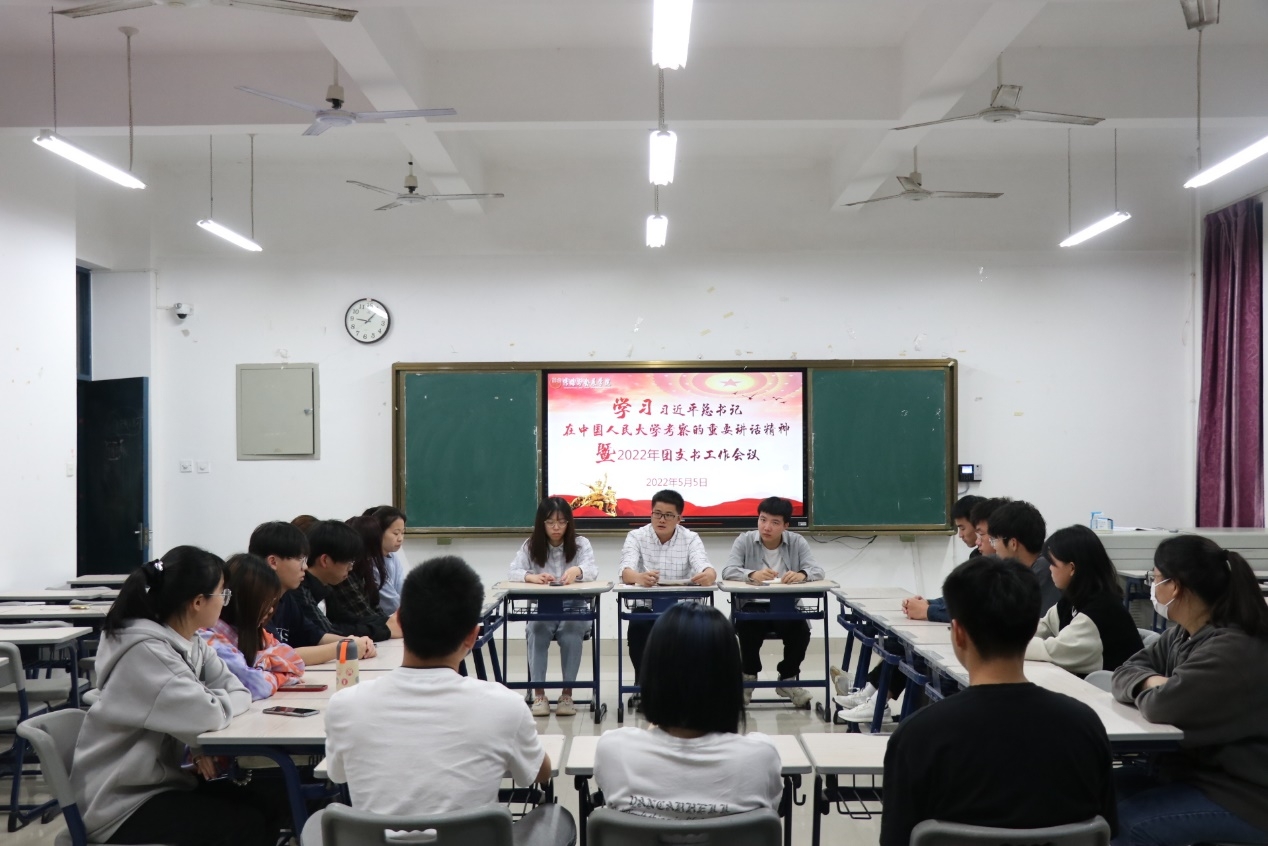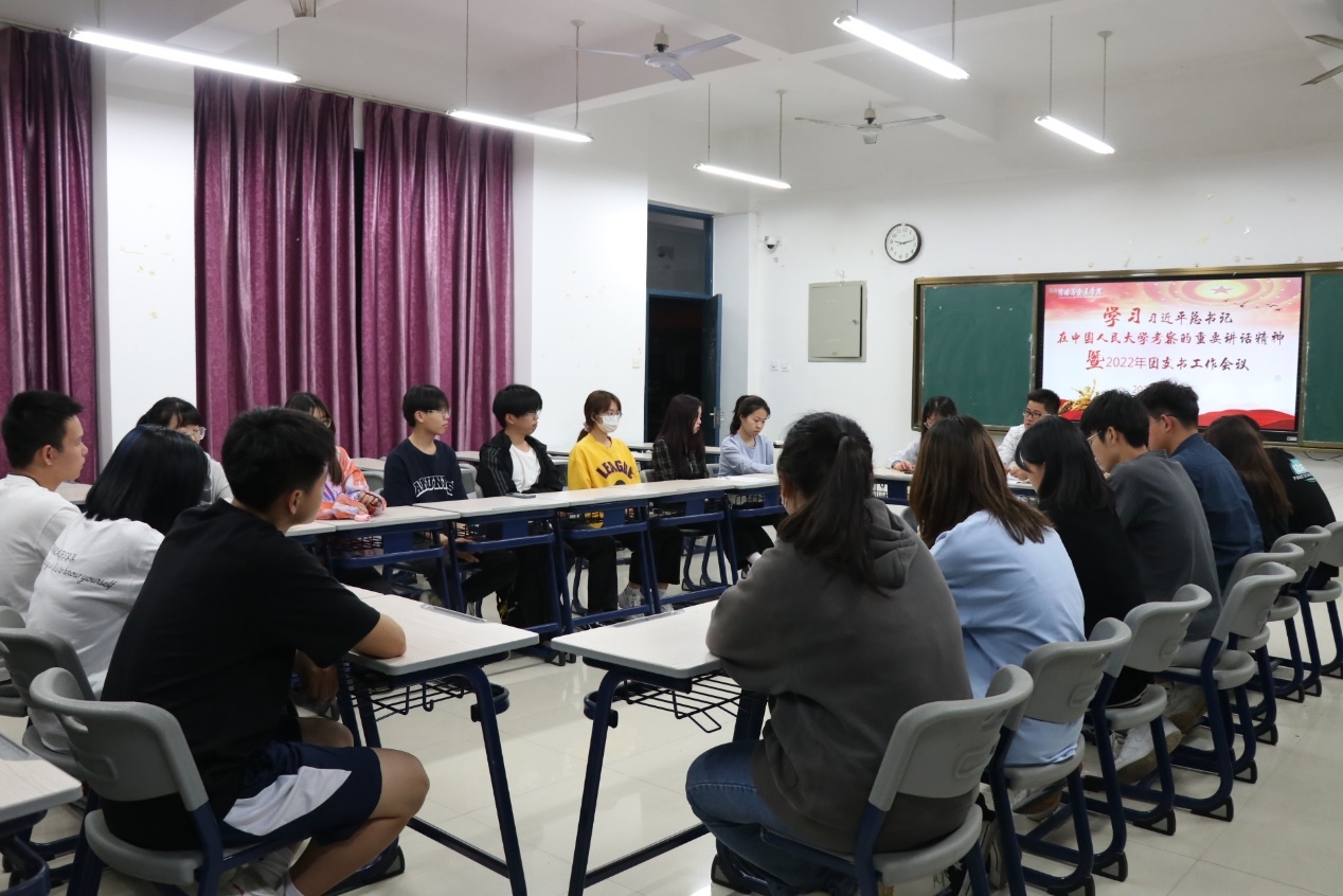 2022年5月5日晚,太阳集团tyc33455学习习近平总书记在中国人民大学考察的重要讲话精神暨2022年团支书工作会于诚信楼302室召开。会议由院团委书记胡瑞安主持,团委部门负责人和20、21级各班团支部书记参会。