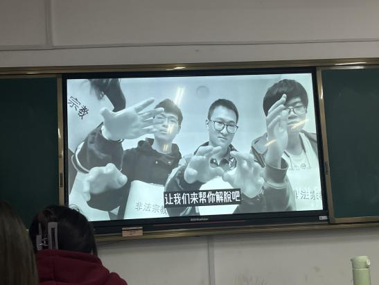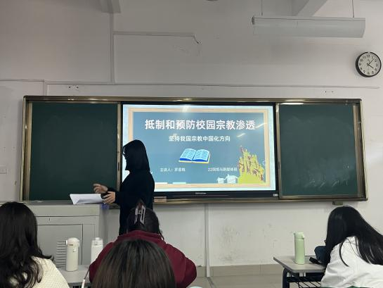 讲座开始,团支书罗恩梅同学通过一段视频向大家说明宗教渗透和不法分子用各种方式屡屡诈骗的行为令人发指。面对宗教渗透我们应该时刻保持清醒的头脑,并且要知法、懂法,坚决抵制校园宗教传播。同时我们要加强思想武装,崇尚科学,警惕邪教和其他非法组织的渗透。最后团支书呼吁同学们从现在开始,从自己做起,相信科学、学习科学、传播科学,树立正确的世界观、人生观、价值观,自觉遵守国家关于宗教法律法规,自觉抵制非法宗教渗透活动,为营造良好的校园文化环境贡献应有的力量。