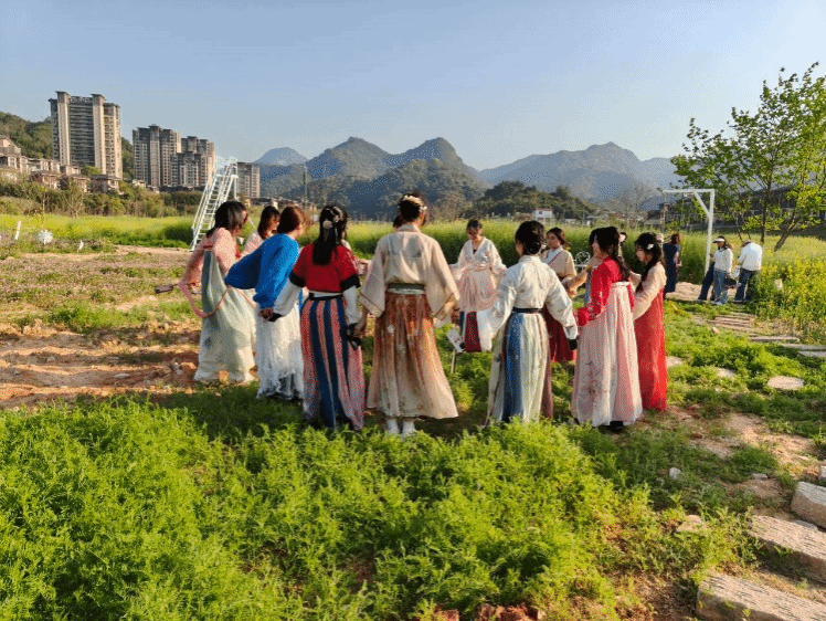 踏入油菜花田,金黄灿烂的花海与蓝天白云相互映衬,构成一幅绝美春日图景。来自贵州侗族的李忠菁同学声情并茂地朗读有关民族共同体意识的诗篇。现场沉浸在浓浓的文化氛围之中。